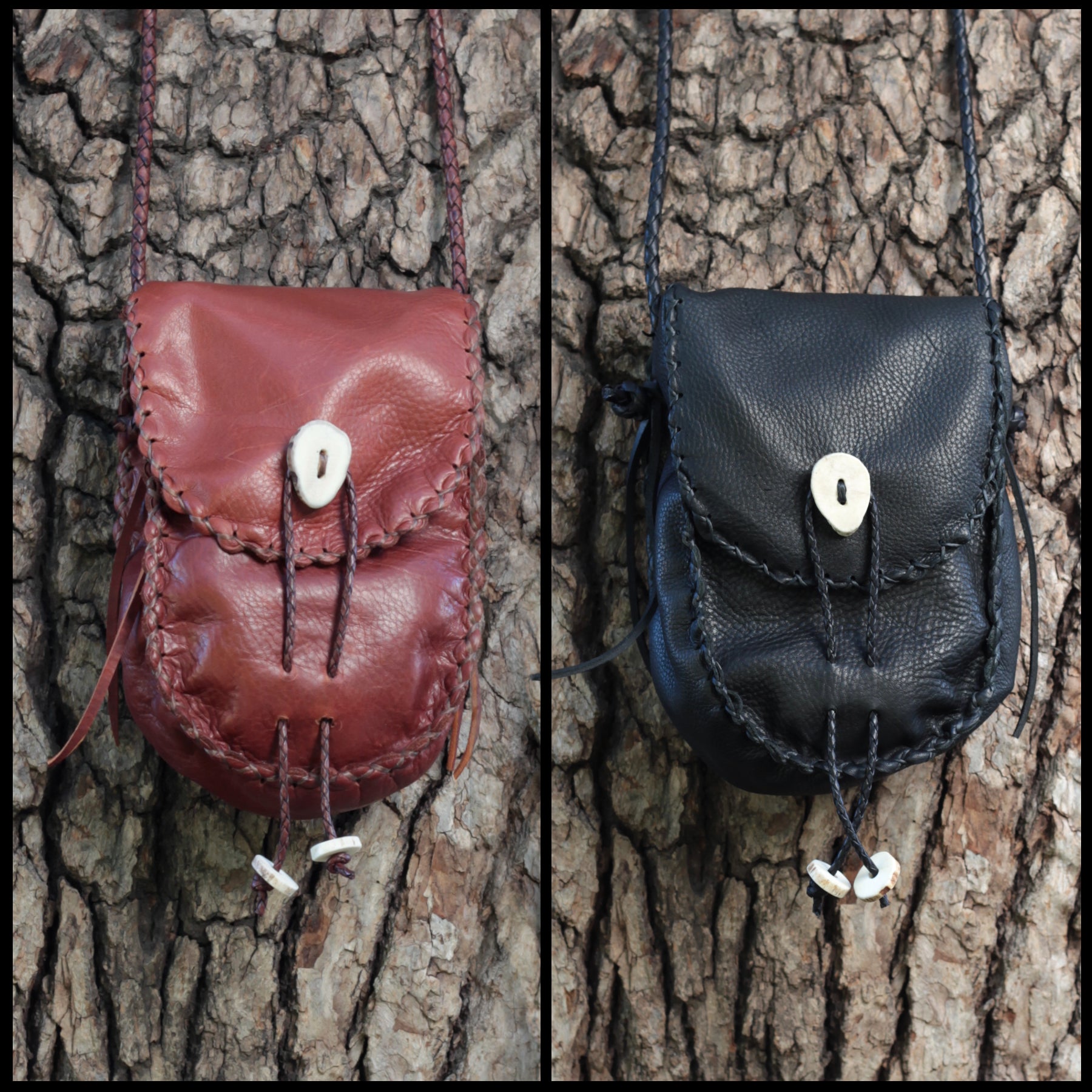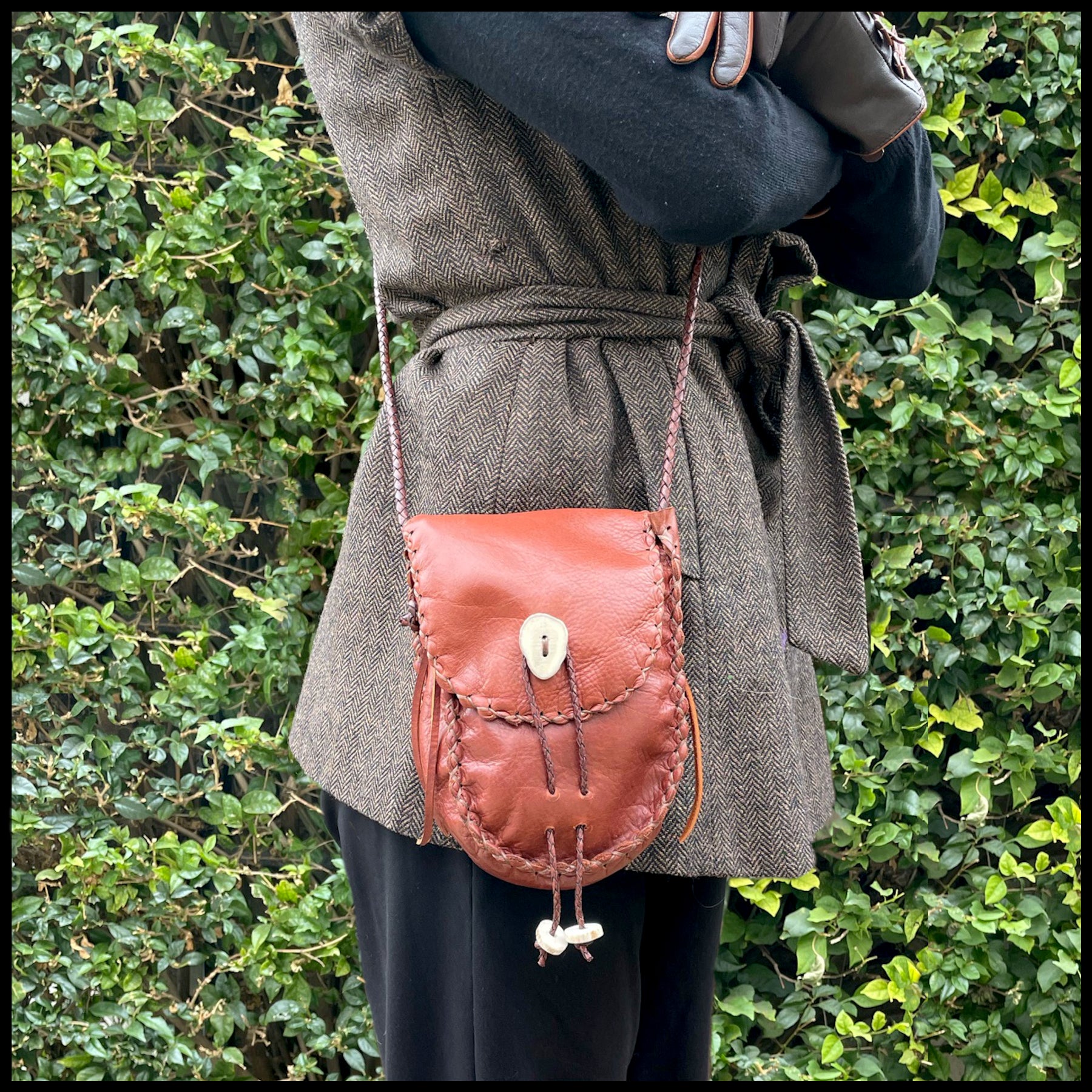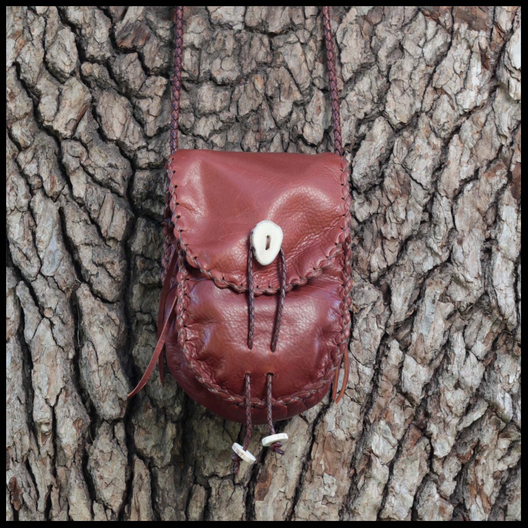Hand-stitched leather shoulder pouch w/ Deer antler toggles & closure